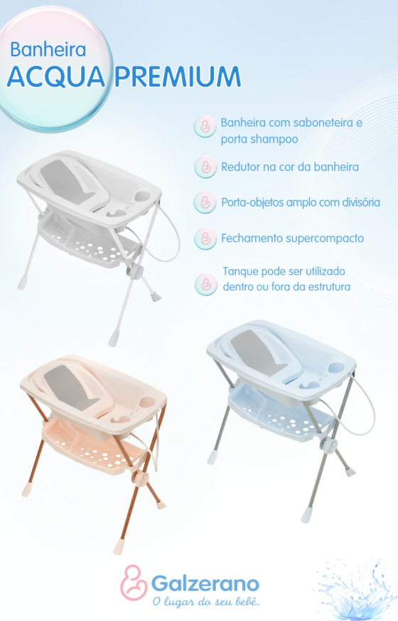 A Banheira Acqua Premium Galzerano é a escolha ideal para tornar o momento do banho mais prático, seguro e confortável para o bebê — desde os primeiros dias de vida. Com design 2 em 1, o tanque pode ser utilizado com ou sem o suporte, adaptando-se ao seu espaço e rotina.