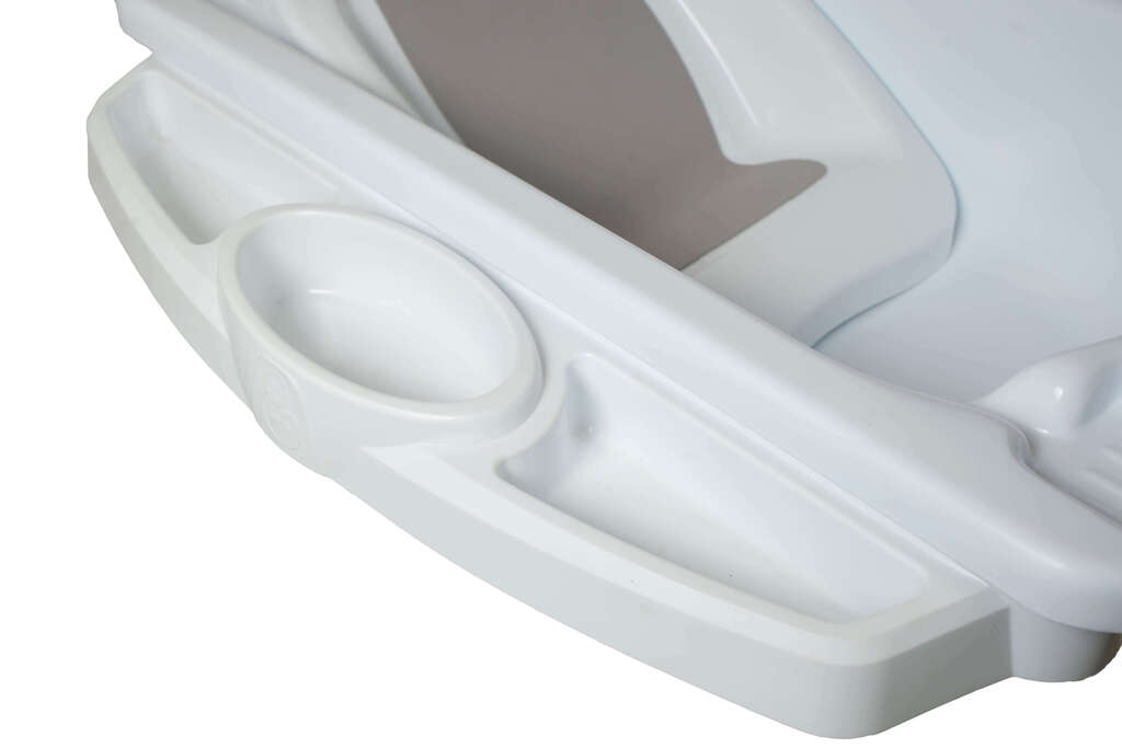 O modelo acompanha assento redutor para recém-nascidos, oferecendo estabilidade desde os primeiros dias. Conta ainda com saboneteira embutida e mangueira para saída de água, garantindo mais praticidade na hora de esvaziar o tanque sem fazer bagunça.